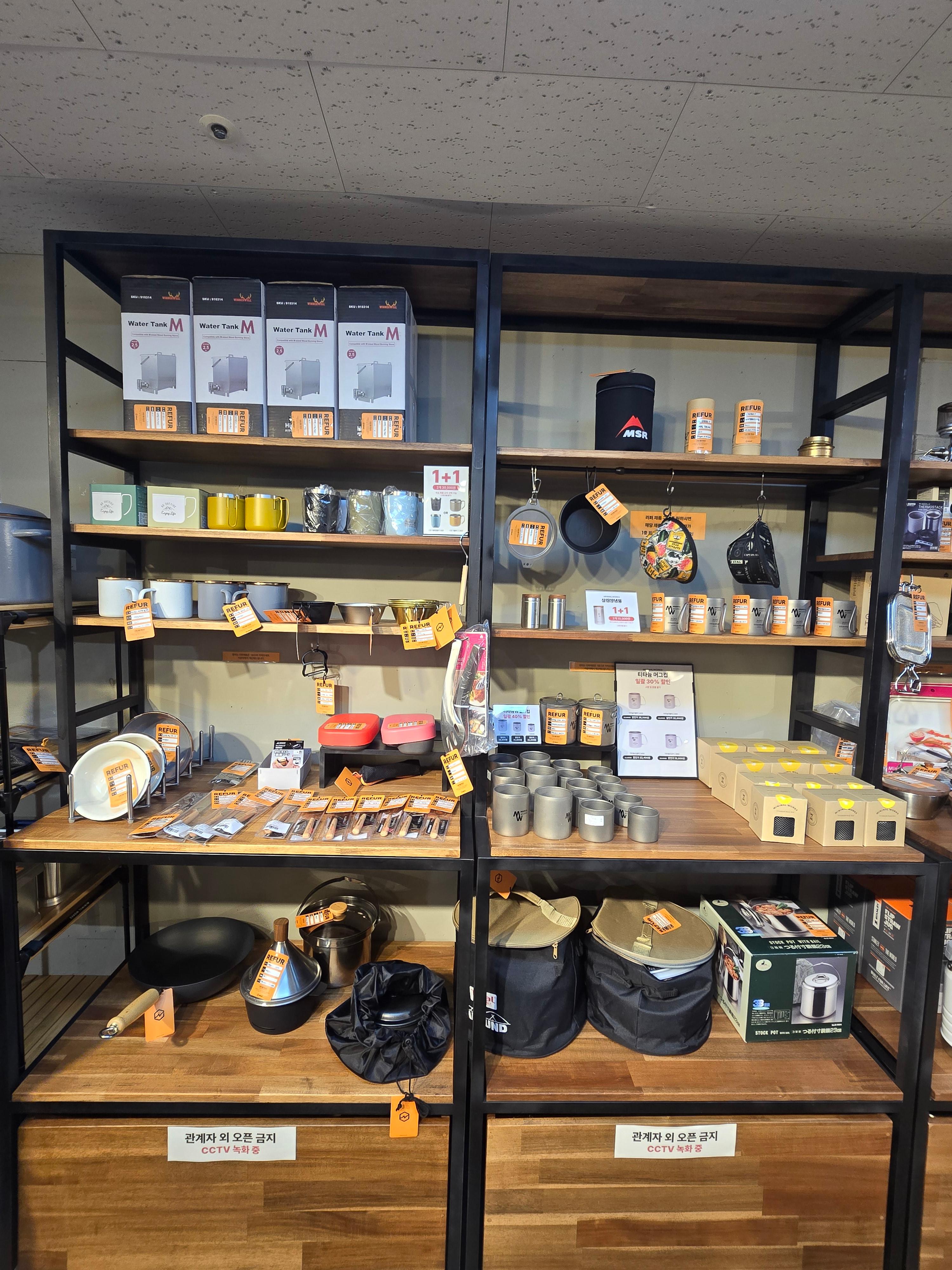감성 아이템 전시 공간 랜턴, 와인잔, 우드 식기류, 거치대 등 감성 캠핑족을 위한 인스타 감성 가득한 소품들도 곳곳에 비치되어 있어 보는 재미가 쏠쏠해요.
