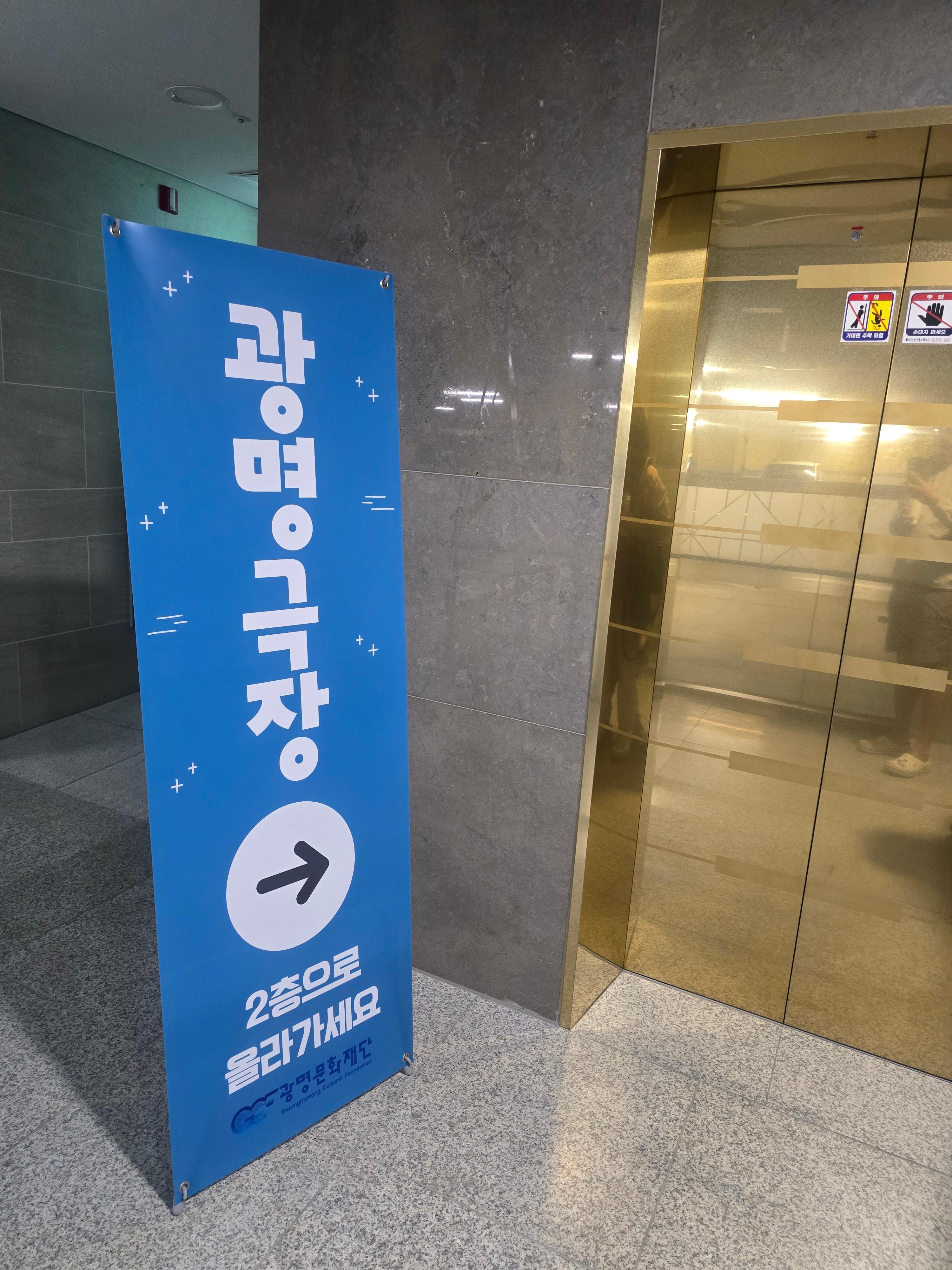 건물 지하1 층 엘리베이터 앞에 파란색 배너로 공연 안내가 잘 되어 있어서