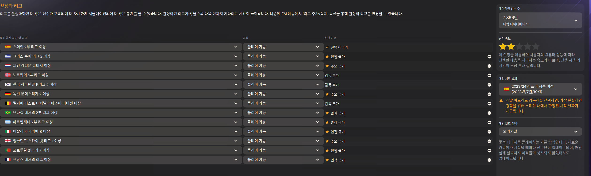 데이터베이스 크기: 초반엔 보통 또는 큼으로 추천 감독 정보 입력: 코치 자격증: 높은 등급일수록 초기 선수들과의 관계/훈련 효과 향상 선수 경력: 리그 수준에 따라 균형 있게 설정