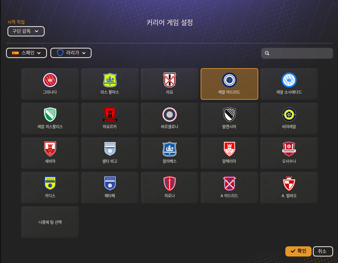 강팀: 바로 성적을 내고 싶은 유저에게 추천 (예: 맨시티, PSG, 바르셀로나) 약팀: 유망주 발굴과 장기적인 성장에 몰입하고 싶은 유저에게 추천 (예: 유스 좋은 브렌트포드, 다름슈타트 등)