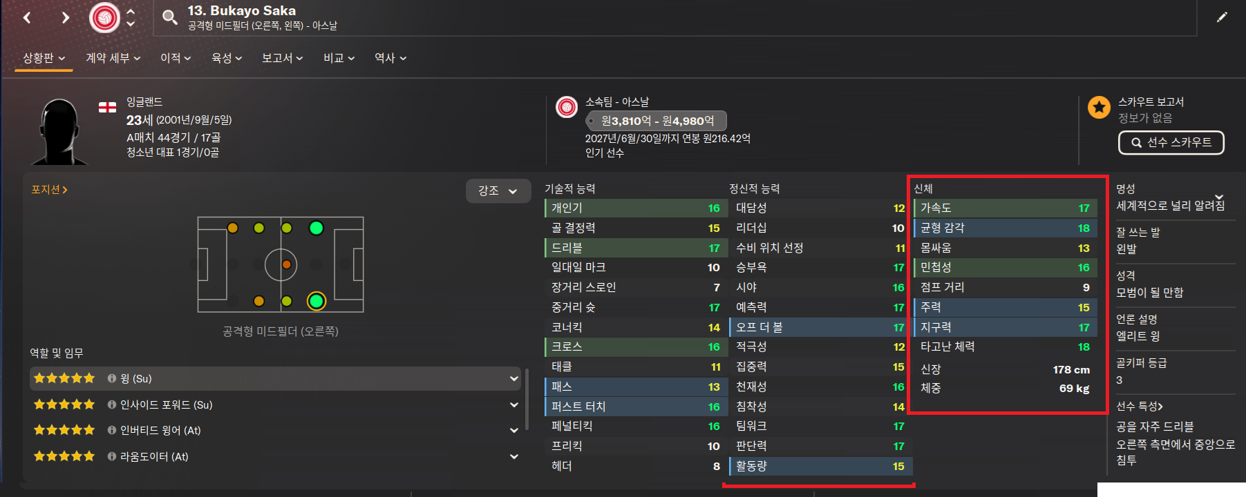몸싸움 20 / 주력 13 / 가속도 12 → 체감 괴물 스트라이커
