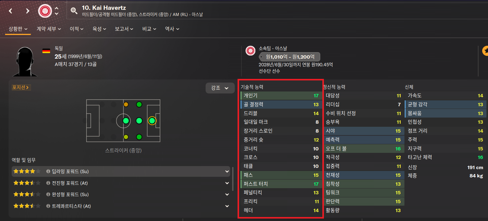 이 항목은 선수의 피지컬, 스피드, 체력 등 기초적인 몸 상태를 나타냅니다.