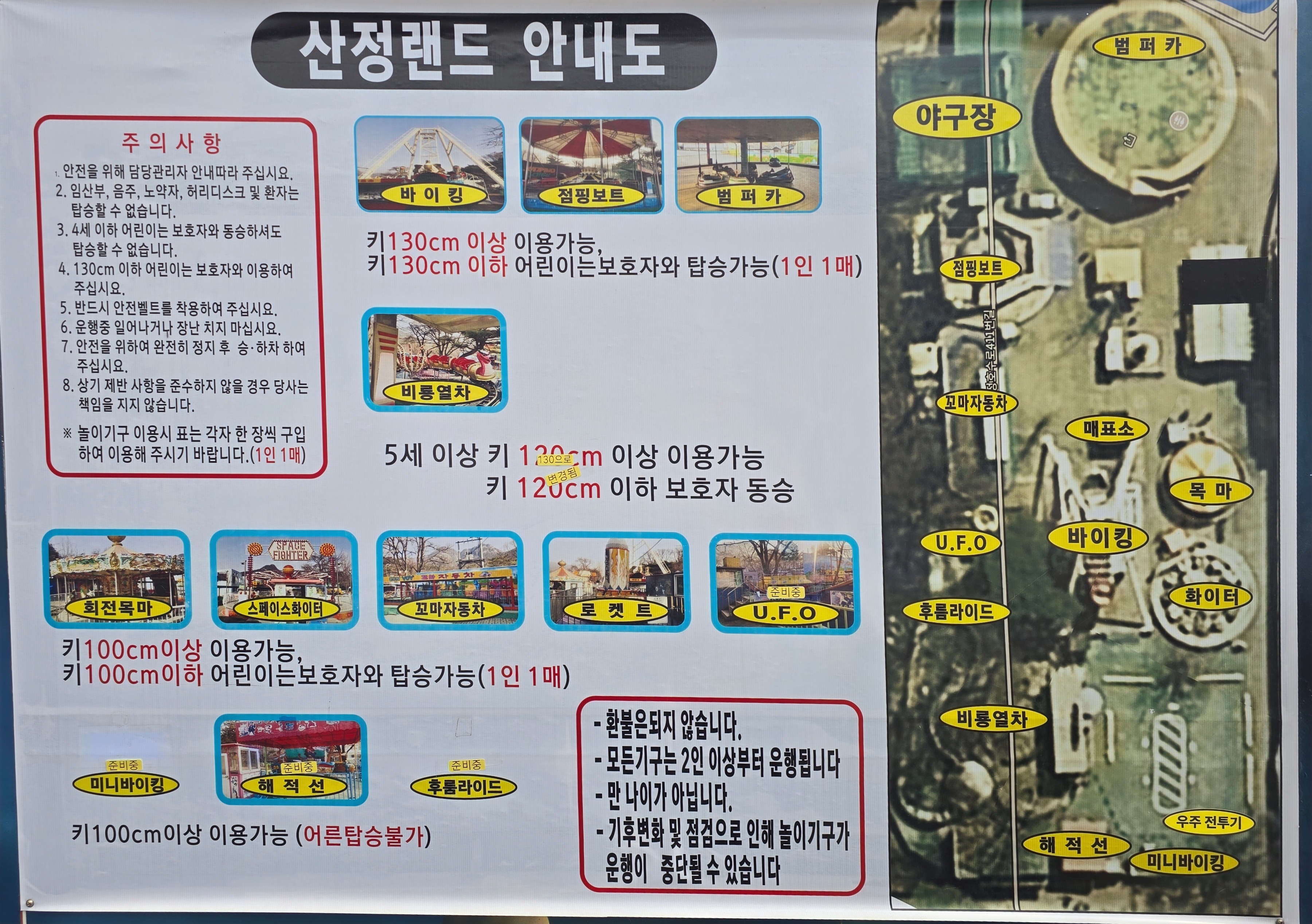 산정랜드 안내도 입니다. 아래와 같은 놀이기구 등이 있어요