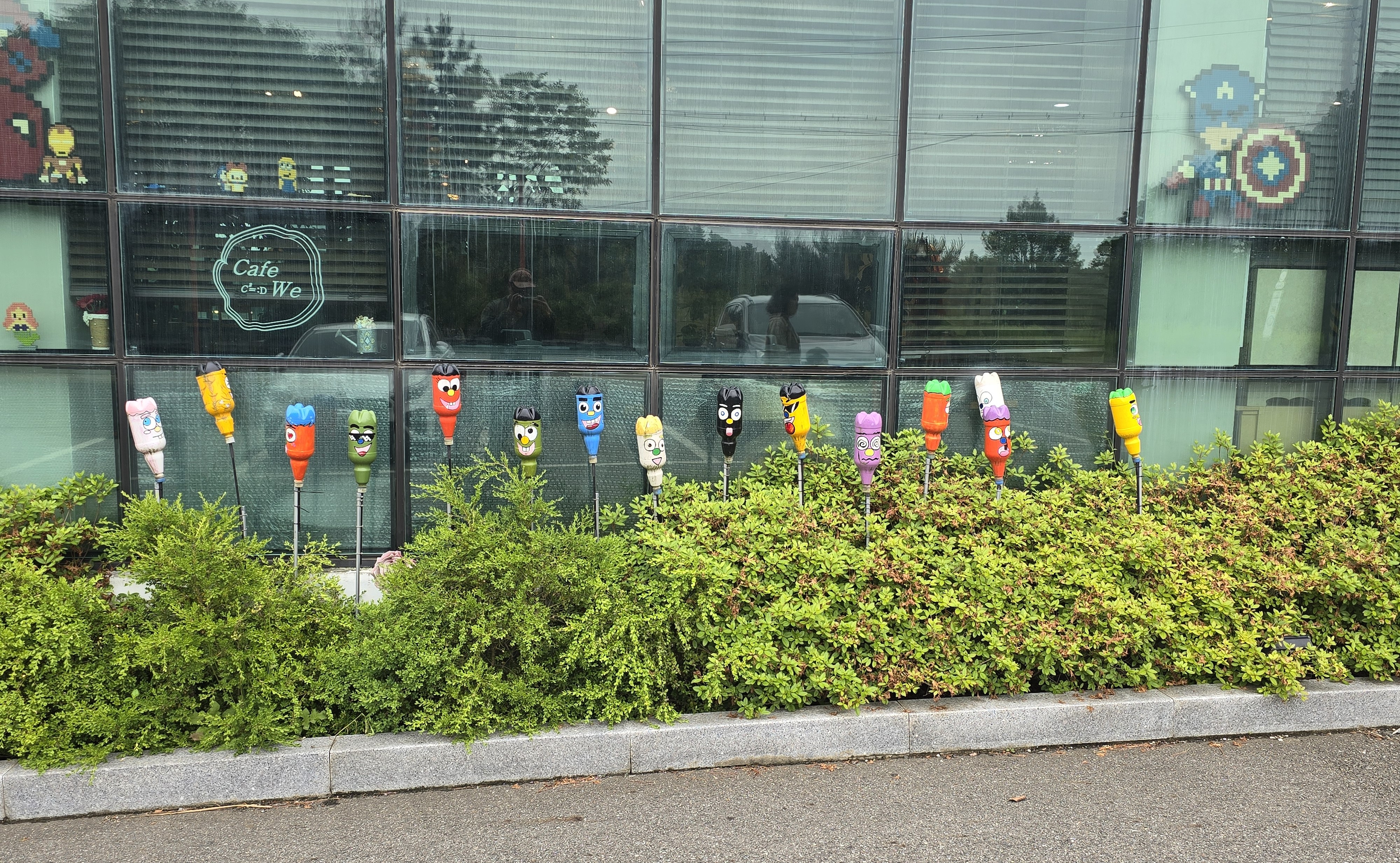 알록 달록 색칠된 페트병에 얼굴을 그려 넣고, 마치 작은 인형처럼 줄 세워져 있어 보는 것만으로도 긴분 좋아지는 유쾌한 공간이었습니다.